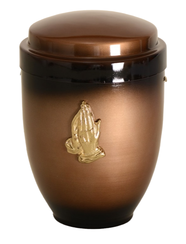 First we take the urn out of the press (cold drawn metal) where it gets its shape, then it is cleaned of oil and grease, sanded, painted and varnished with high quality materials, which are also used in the automotive industry. The urns are checked the next day, polished if necessary and fitted with high-quality brass decorations (crosses, flowers, hands ...) during assembly.