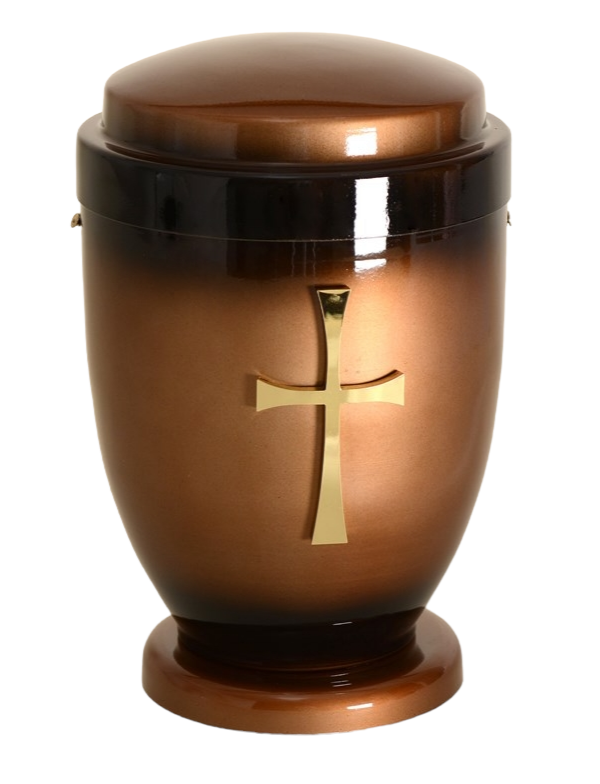 First we take the urn out of the press (cold drawn metal) where it gets its shape, then it is cleaned of oil and grease, sanded, painted and varnished with high quality materials, which are also used in the automotive industry. The urns are checked the next day, polished if necessary and fitted with high-quality brass decorations (crosses, flowers, hands ...) during assembly.