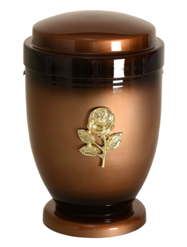 First we take the urn out of the press (cold drawn metal) where it gets its shape, then it is cleaned of oil and grease, sanded, painted and varnished with high quality materials, which are also used in the automotive industry. The urns are checked the next day, polished if necessary and fitted with high-quality brass decorations (crosses, flowers, hands ...) during assembly.