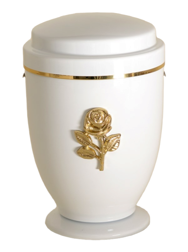 First we take the urn out of the press (cold drawn metal) where it gets its shape, then it is cleaned of oil and grease, sanded, painted and varnished with high quality materials, which are also used in the automotive industry. The urns are checked the next day, polished if necessary and fitted with high-quality brass decorations (crosses, flowers, hands ...) during assembly.