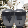 First we take the urn out of the press (cold drawn metal) where it gets its shape, then it is cleaned of oil and grease, sanded, painted and varnished with high quality materials, which are also used in the automotive industry. The urns are checked the next day, polished if necessary and fitted with high-quality brass decorations (crosses, flowers, hands ...) during assembly.