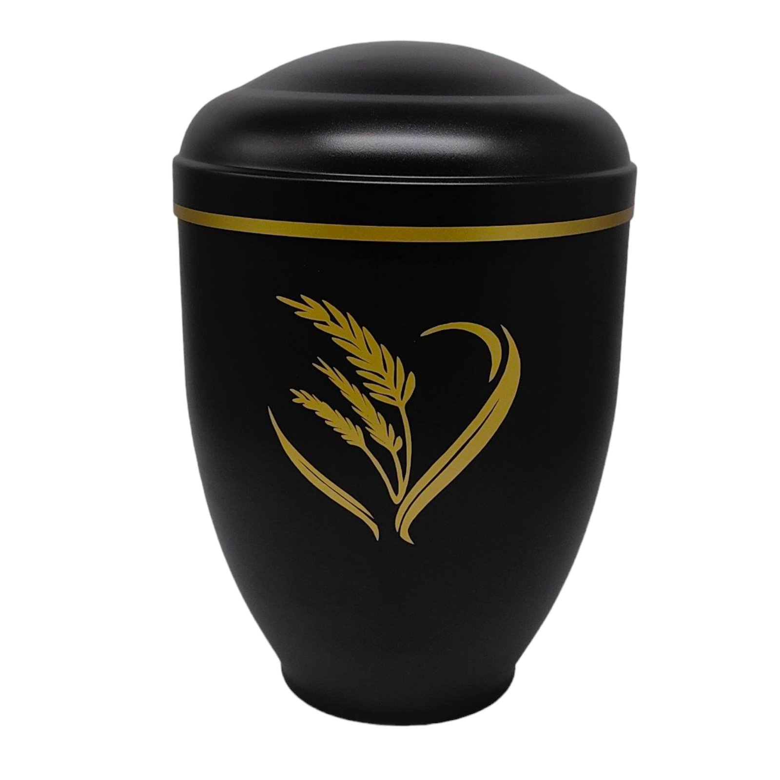 First we take the urn out of the press (cold drawn metal) where it gets its shape, then it is cleaned of oil and grease, sanded, painted and varnished with high quality materials, which are also used in the automotive industry. The urns are checked the next day, polished if necessary and fitted with high-quality brass decorations (crosses, flowers, hands ...) during assembly.