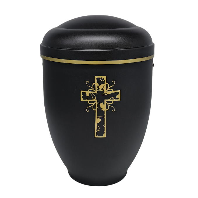 First we take the urn out of the press (cold drawn metal) where it gets its shape, then it is cleaned of oil and grease, sanded, painted and varnished with high quality materials, which are also used in the automotive industry. The urns are checked the next day, polished if necessary and fitted with high-quality brass decorations (crosses, flowers, hands ...) during assembly.