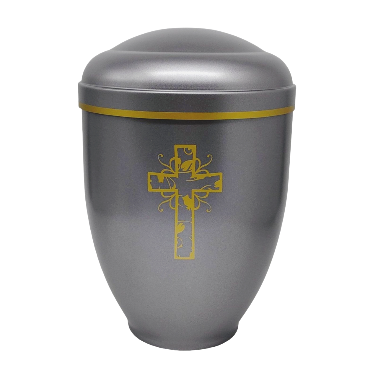First we take the urn out of the press (cold drawn metal) where it gets its shape, then it is cleaned of oil and grease, sanded, painted and varnished with high quality materials, which are also used in the automotive industry. The urns are checked the next day, polished if necessary and fitted with high-quality brass decorations (crosses, flowers, hands ...) during assembly.