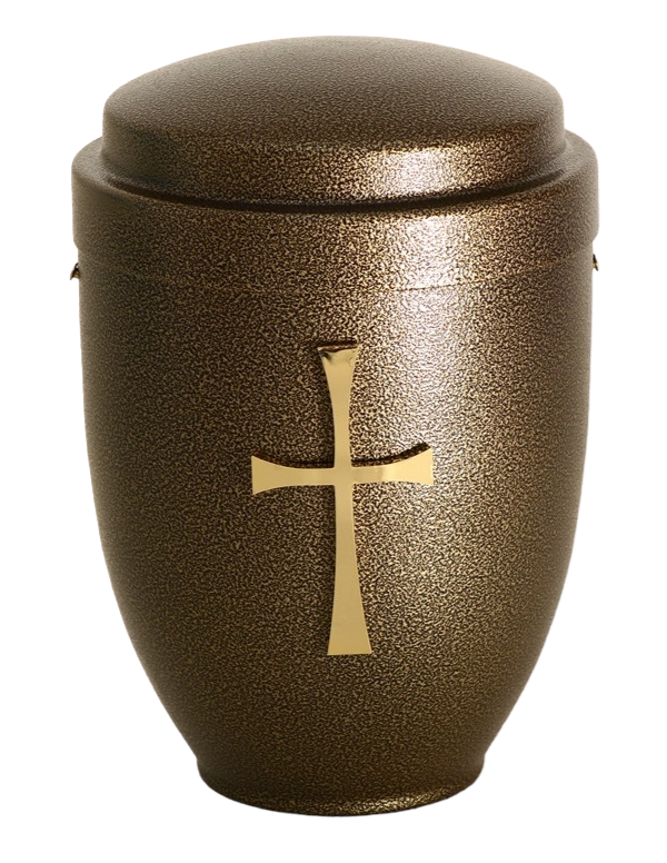 First we take the urn out of the press (cold drawn metal) where it gets its shape, then it is cleaned of oil and grease, sanded, painted and varnished with high quality materials, which are also used in the automotive industry. The urns are checked the next day, polished if necessary and fitted with high-quality brass decorations (crosses, flowers, hands ...) during assembly.
