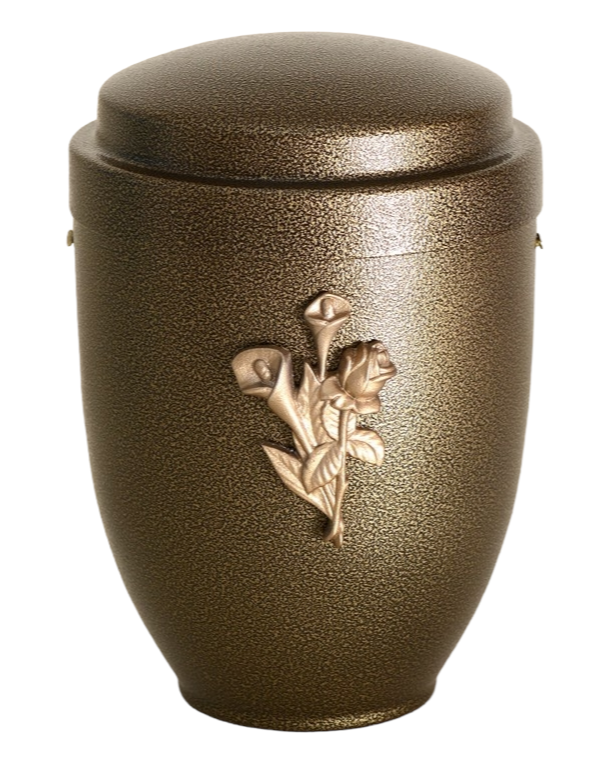 First we take the urn out of the press (cold drawn metal) where it gets its shape, then it is cleaned of oil and grease, sanded, painted and varnished with high quality materials, which are also used in the automotive industry. The urns are checked the next day, polished if necessary and fitted with high-quality brass decorations (crosses, flowers, hands ...) during assembly.