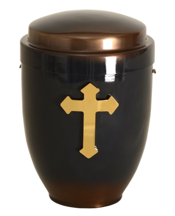 First we take the urn out of the press (cold drawn metal) where it gets its shape, then it is cleaned of oil and grease, sanded, painted and varnished with high quality materials, which are also used in the automotive industry. The urns are checked the next day, polished if necessary and fitted with high-quality brass decorations (crosses, flowers, hands ...) during assembly.