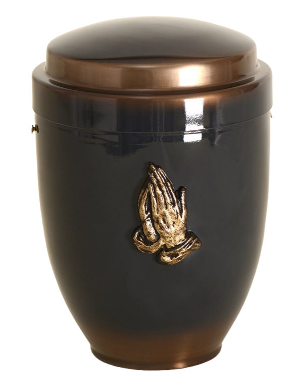 First we take the urn out of the press (cold drawn metal) where it gets its shape, then it is cleaned of oil and grease, sanded, painted and varnished with high quality materials, which are also used in the automotive industry. The urns are checked the next day, polished if necessary and fitted with high-quality brass decorations (crosses, flowers, hands ...) during assembly.