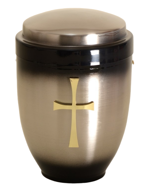 First we take the urn out of the press (cold drawn metal) where it gets its shape, then it is cleaned of oil and grease, sanded, painted and varnished with high quality materials, which are also used in the automotive industry. The urns are checked the next day, polished if necessary and fitted with high-quality brass decorations (crosses, flowers, hands ...) during assembly.