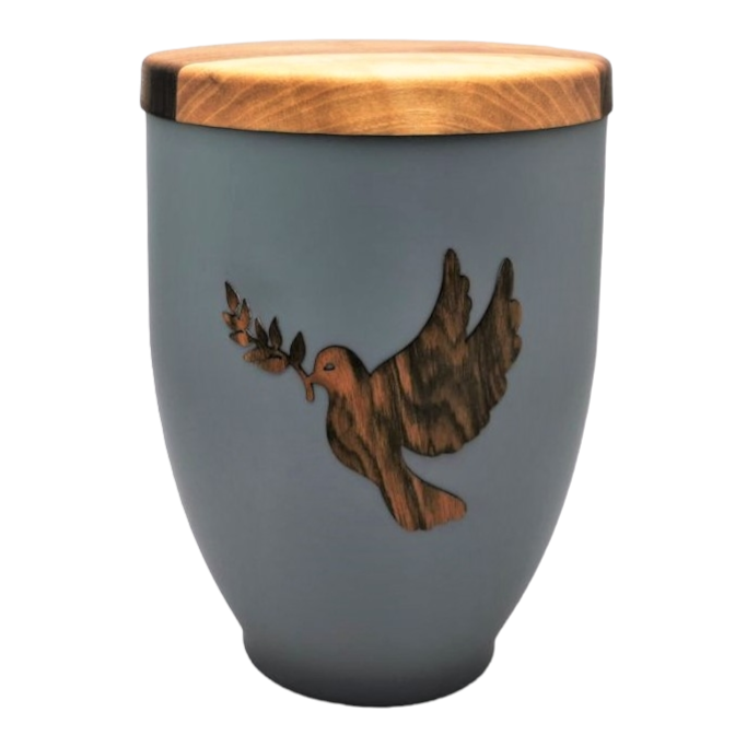 This modern grey urn with picture (laser cut furnier) and wooden cap is very nice for the last trip of our loved ones.