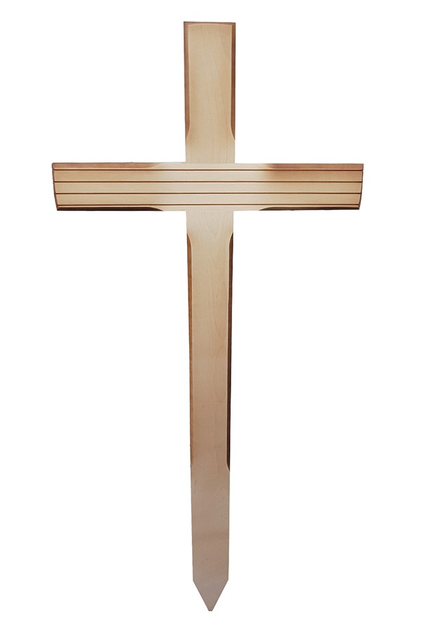 211 We also make grave wooden crosses. They are made out of beech tree. They are good protected against weathering. In the foreground are two different types. Ones are wider and with larger edges, at the bottom they are pointed. They are weatherproff varnished. They are more expensive and also include plastik crucifix in the price. Others are simpler. Both can be equiped with or without notches. We also have the possibility to attach crucifix on a small wooden cross.